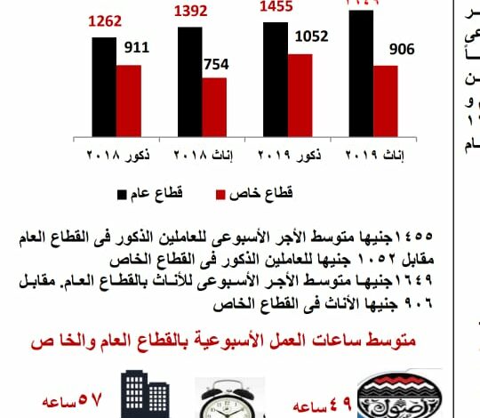 أصدر الجهاز المركزي للتعبئة العامة والإحصاء اليوم السبت الموافق 19 / 10 / 2024 النشرة السنوية لإحصاءات التوظف والأجور وساعات العمل عام 2023, تعد نشرة التوظف والأجور وساعات العمل من النشرات الهامة التي يصدرها الجهاز حيث يتم الاعتماد عليها في تحديد الحد الأدنى لأجور العاملين بالقطاع العام/الأعمال العام والقطاع الخاص ومن أهم المؤشـــرات:5005 جنيهـات متوسط الاجر الشهري للعاملين في كل من القطاع العام / الأعمال العام والقطاع الخاص مقابل 4284 جنيهاً عام 2022 بنسبة زيادة 16.8%.12401جنيهـاً متوسط الأجر الشهري فى القطاع العام / الأعمال العام مقابل 4675 جنيهاً للقطاع الخاص . متوسط الأجر النقدي الشهري بالجنيه بالقطاع العام / الأعمال العام والقطاع الخاص عام 2023 5128 جنيهاً متوسط أجر الذكور فى كل من القطاع العام / الأعمال العام والقطاع الخاص عام 2023.4439 جنيهاً متوسط أجر الإناث فى كل من القطاع العام / الأعمال العام والقطاع الخاص عام 2023 . 12183 جنيهاً متوسط أجر الذكور فى القطاع العام / الأعمال العام مقابل 4808 جنيهاً للذكور في القطاع الخاص عام 2023 .13496جنيهاً متوسط أجر الإناث فى القطاع العام / الأعمال العام مقابل 4064 جنيهاً للإناث في القطاع الخاص عام 2023. 19179 جنيهاً متوسط الأجر الشهري للعاملين في المعلومات والاتصالات في كل من القطاع العام/ الأعمال العام والقطاع الخاص بلغ متوسط الأجر الشهري لأهم الأنشطة الأقتصادية كالآتى:19179 جنيهاً لنشاط المعلومات والاتصالات 18665 للذكور مقابل 20646 جنيهاً للإناث.13402 جنيهاً لنشاط الكهرباء والغاز 13181 جنيهاً للذكور مقابل 14615 جنيهاً للإناث.12494 جنيهاً لنشاط الوساطة المالية والتأمين 13654 جنيهاً للذكور مقابل 8993 جنيهاً للإناث.7669 جنيهاً لنشاط التعدين واستغلال المحاجر 7851 جنيهاً للذكور مقابل 6706 للإناث .7340 جنيهاً لنشاط التشييد والبناء 7256 جنيهاً للذكور مقابل 8017 للإناث. 205 ساعة متوسط عدد ساعات العمل الشهرية للعاملين في كل من القطاع العام/ الأعمال العام والقطاع الخاص بلغ متوسط عدد ساعات العمل الشهرية كالاتى : 205 ساعة للعاملين فى القطاع العام/ الأعمال العام والقطاع الخاص.185 ساعة للعاملين فى القطاع العام / الأعمال العام.206 ساعة للعاملين فى القطاع الخاص.