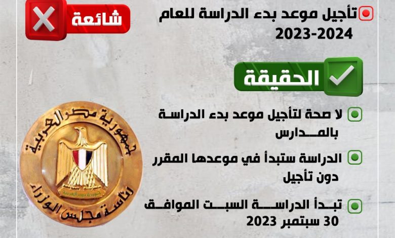 القاهرة فى 14 سبتمبر /أ ش أ/ نفى المركز الإعلامي لمجلس الوزراء صحة ما تداول ببعض صفحات التواصل الاجتماعي من منشور منسوب لوزارة التربية والتعليم يزعم تأجيل تنفيذ قرارات إعادة هيكلة المرحلة الثانوية إلى العام الدراسي (2025 – 2026) .