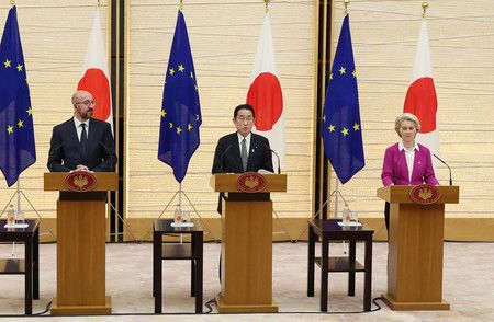 طوكيو في 3 يوليو /أ ش أ/ ذكرت مصادر دبلوماسية في اليابان اليوم /الإثنين/ أن اليابان والاتحاد الأوروبي يدرسان إصدار بيان مشترك يعلنان فيه عزمهما على تعزيز التعاون الأمني البحري والفضائي الإلكتروني وسلسلة التوريد بعد اجتماع زعمائهما الأسبوع المقبل.