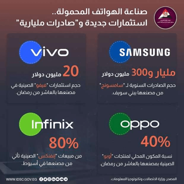 كما تصل نسبه المكون المحلي لشركه اوبو الصينية بمصنعها بمدينه العاشر من رمضان الى 40% .