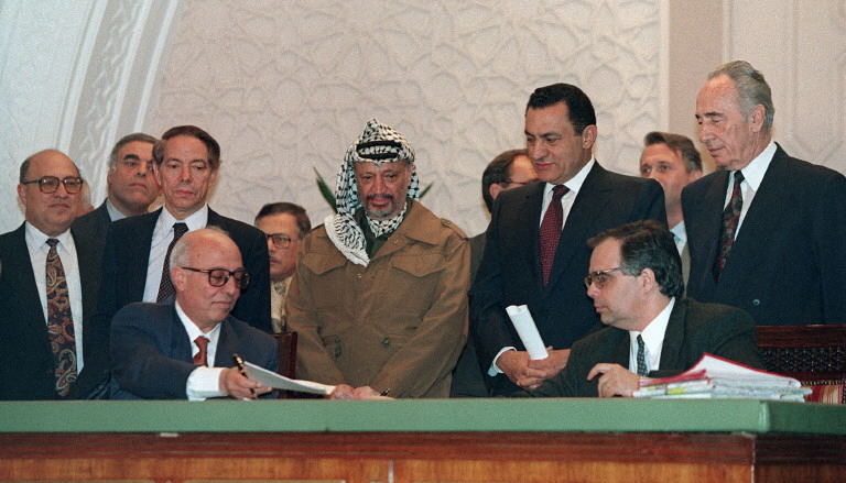 توقيع اتفاق ‘لان المبادي بين اسرائيل ومنظمة التحرير الفلسطينية عام 1994م في القاهرة